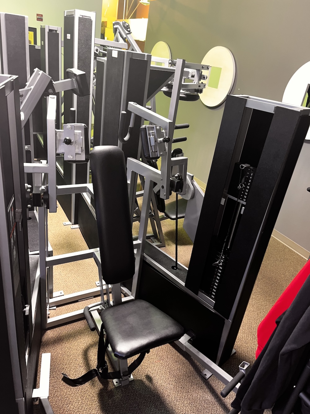Angular design allows greater range of motion. Adjustable seat, back and elbow pads for optimal positioning of user. Assist pedal allows easy entry into machine. LOCATED IN OREGON.